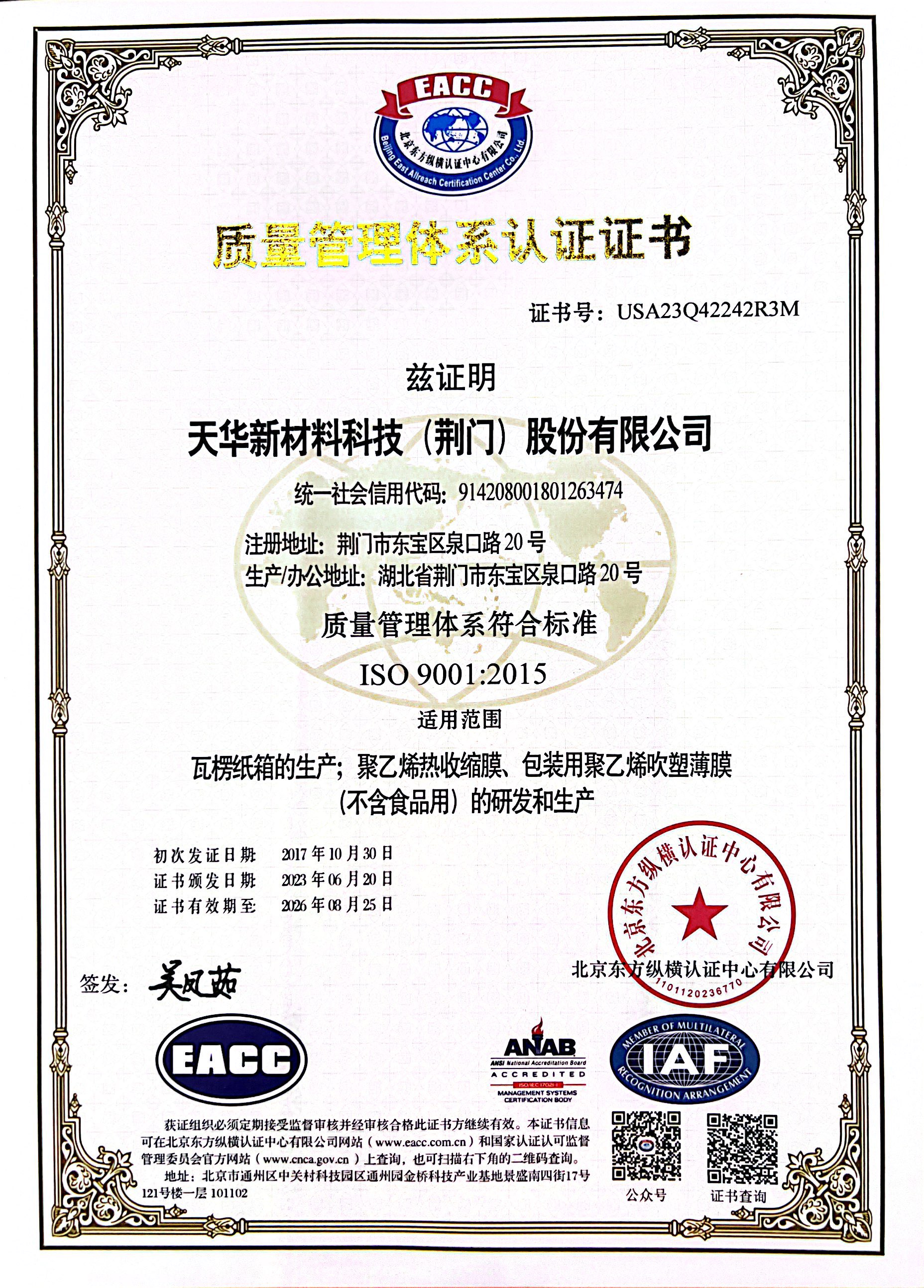 天華新材料科技(荊門)股份有限公司質量管理體系認證證書